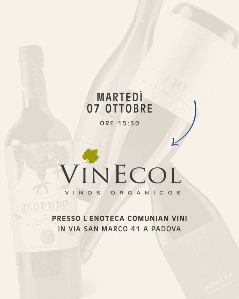Martedì 07 Ottobre dalle 15:30, presso l’Enoteca Comunian Vini, degusteremo i vini organici di VinEcol, un progetto nato con l’obiettivo di creare una cantina focalizzata su vini biologici di alta qualità che si distinguessero per la cura artigianale durante tutto il processo.