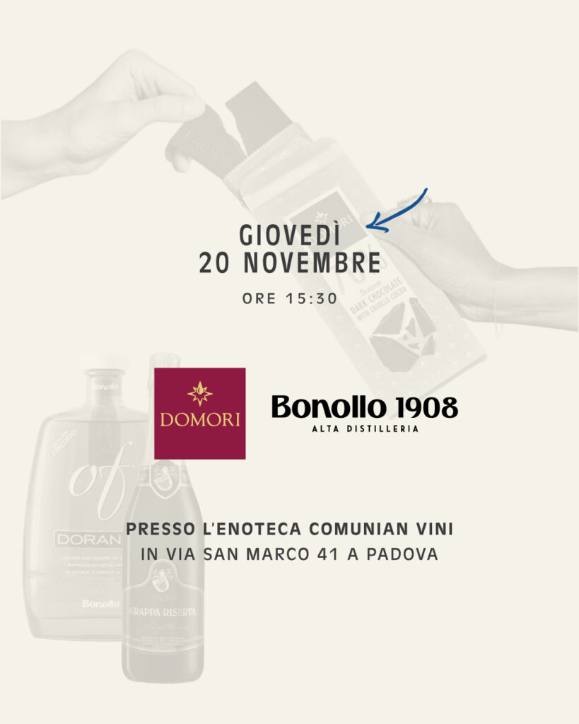 Giovedì 20 novembre dalle 15:30, presso l’Enoteca Comunian Vini, vi aspettiamo per una masterclass dedicata all’incontro tra il cioccolato Domori e la grappa Bonollo.