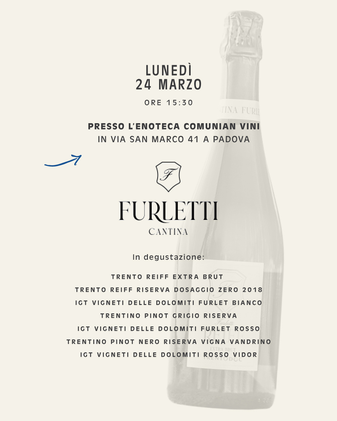 Lunedì 24 Marzo dalle 15:30, presso l'Enoteca Comunian Vini, vi invitiamo a una degustazione dedicata ai vini dell'Azienda Furletti Gabriele, una realtà d'artigianato situata nel Garda Trentino dove la qualità è al principio di tutto.