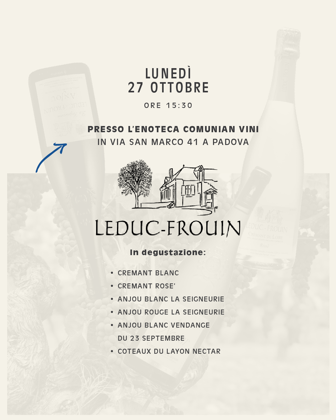 Lunedì 27 Ottobre dalle 15.30 presso la nostra sede avremo la possibilità di assaporare i vini di Leduc-Frouin, un'azienda familiare fondata nel 1873 che combina tradizione e modernità, impegnandosi a offrire vini delicati e sorprendenti, tipici dell'Anjou.