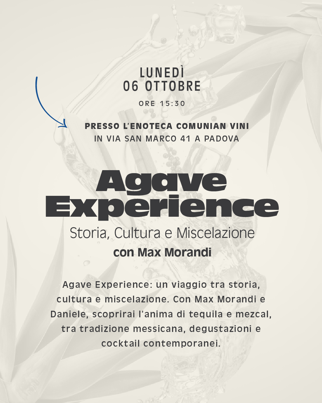 Lunedì 06 Ottobre dalle 15:30, presso l’Enoteca Comunian Vini, Agave Experience: un viaggio tra storia, cultura e miscelazione. Con Max Morandi e Daniele Benetello, scoprirai l'anima di tequila e mezcal, tra tradizione messicana, degustazioni e cocktail contemporanei.