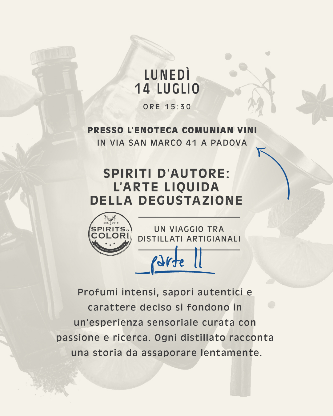 Lunedì 14 Luglio dalle 15:30, presso l’Enoteca Comunian Vini, la seconda parte del viaggio tra i distillati artigianali di Spirts & Colori. Un assortimento caratterizzato da piccoli produttori di qualità mondiale e capace di stupire anche i palati più esigenti.